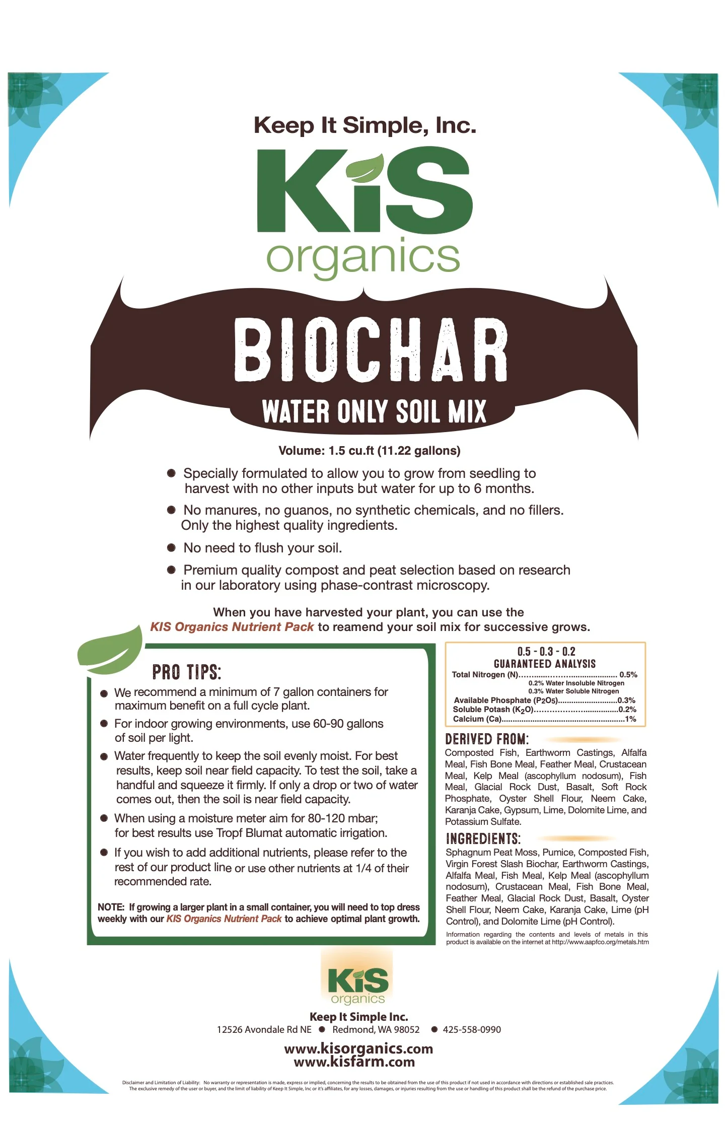NOTE: If growing a larger plant in a small container, you will need to top dress weekly with our KiS Organics Nutrient Pack to achieve optimal plant growth.